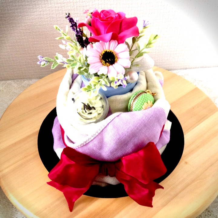 紫のオーガニックガーゼのバスタオルをケーキの土台にし、ピンクのソープフラワーのアレンジメント・500円玉が入るマカロン型ストラップ・カップケーキ型入浴剤をデコレートしました。